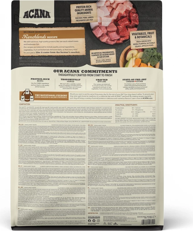 In het wild zijn honden carnivoren die bijna uitsluitend vlees eten en slechts enkele koolhydraten nodig hebben om aan hun dagelijkse behoeften te voldoen. Het merk ACANA heeft een assortiment graanvrije hondenvoeding van topkwaliteit gecreëerd dat minimaal 70% vlees garandeert, waarvan de helft vers is. Regionaal eten komt van niet-extensieve landbouw of duurzame visserij in West-Canada.