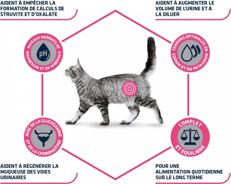 – Vermindert de vorming van struvietstenen en kristallen en draagt bij tot hun oplossing dankzij de regulering van de pH van de urine