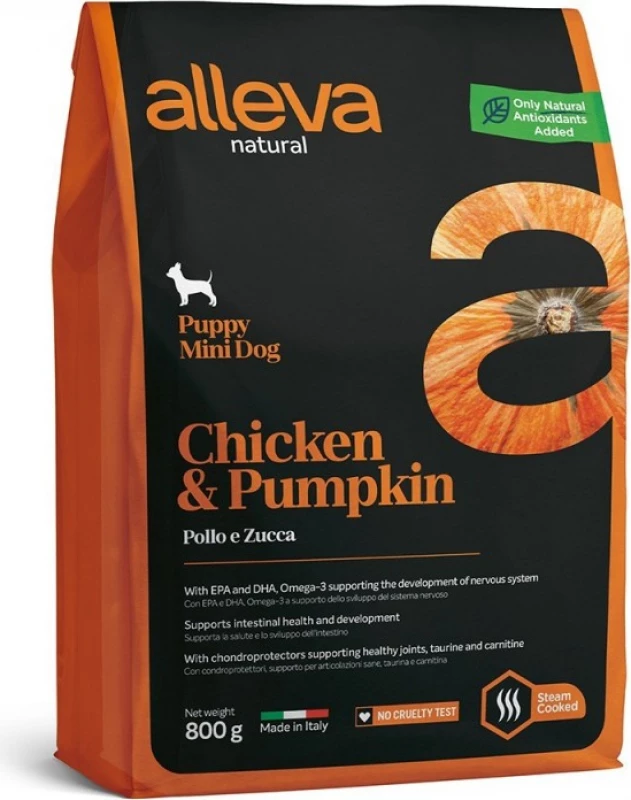 BESCHRIJVING VAN ALLEVA Natural Puppy Mini – Kip & Pompoen