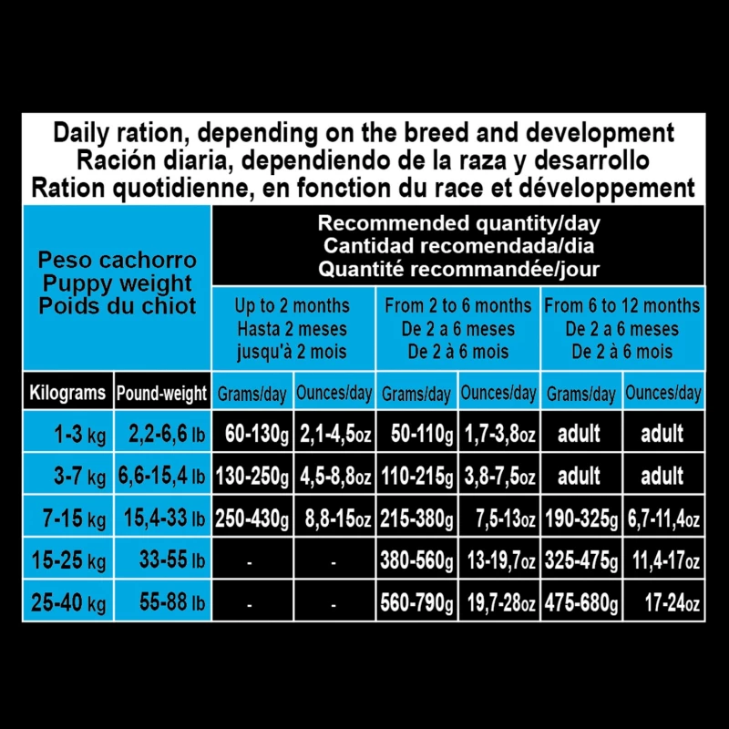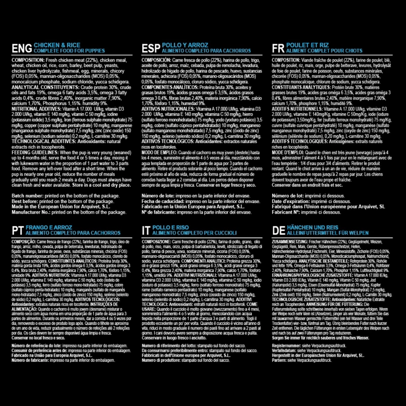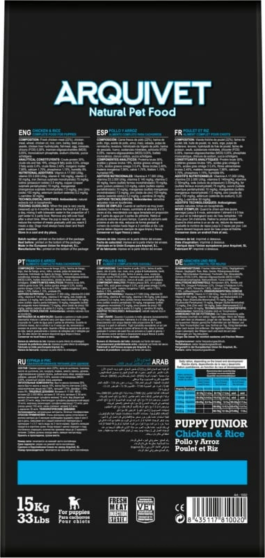 ARQUIVET Puppy & Junior met Kip & Rijst voor puppy’s wordt aanbevolen voor puppy’s en jonge honden van standaardmaat, vanaf het spenen tot ongeveer één jaar. De voeding bevordert de spierontwikkeling en versterkt de botten dankzij de aanvoer van verse eiwitten. De vitamine-mineralenbalans verbetert het immuunsysteem door de beschermende barrières van de huid, het haar en de slijmvliezen te versterken.