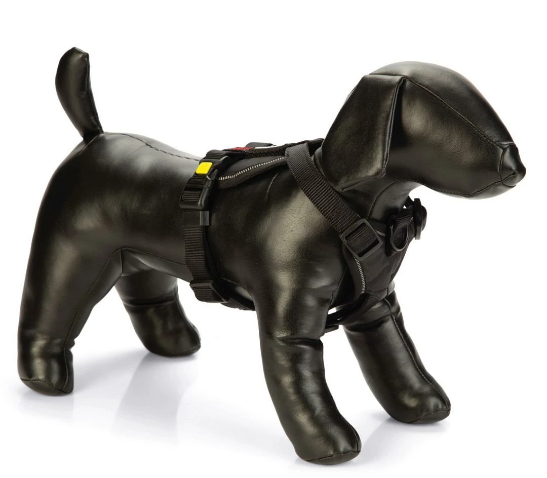 Luxe, volledig verstelbaar, nylon Y-tuig met neopreen voering. Om trekken tegen te gaan kan de riem ook aan de voorkant van het tuig bevestigd worden.