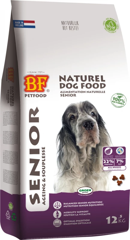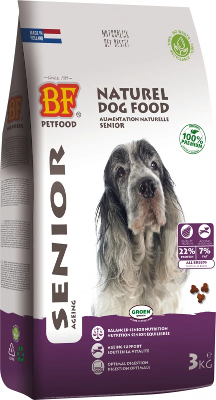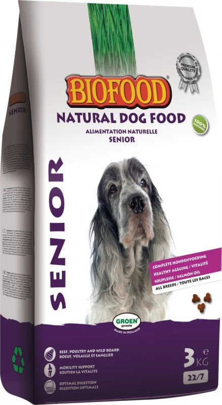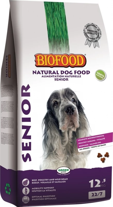 BIOFOOD Senior is een volledige licht verteerbare, natuurlijke en zeer smaakvolle hondenvoeding speciaal ontwikkeld voor oudere honden. 47% rund, gevogelte, wild zwijn en rijst. Met zalmolie, glucosamine, chondroïtine en echinacea kruiden. Hoge acceptatie en verteerbaarheid. Gereduceerd energie-, eiwit-, vet- en mineralengehalte. Ondersteunt mobiliteit en gewrichten. Vitamine E en selenium, een antioxidantcomplex, beschermt tegen celveroudering. Zonder chemische toevoegingen. Optimale voeding die zorgt voor een betere vertering, ontlasting en een goede conditie van je hond. Voor alle hondenrassen.