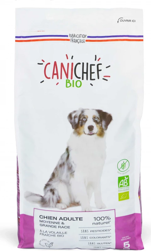 CANICHEF BIO voor honden Medium / Maxi zijn een compleet en uitgebalanceerd voer dat voldoet aan de behoeften van volwassen honden van middelgrote en grote rassen van meer dan 10 kg. Deze biologische brokjes bevatten geen granen, ggo’s, gluten, kleurstoffen of conserveermiddelen en voorzien je hond van alle essentiële voedingsstoffen voor een goede gezondheid. Deze hondenbrokjes zijn AB BIO gecertificeerd door de organisatie Ecocert en zijn 100% made in France (in Mayenne). De ingrediënten zijn ook 100% Frans.