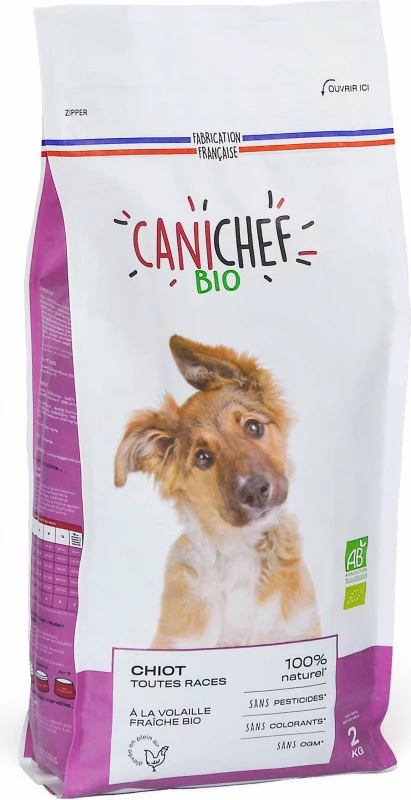 CANICHEF BIOLOGISCH droogvoer voor puppy’s is een complete en uitgebalanceerde voeding die voldoet aan de specifieke behoeften van deze belangrijke levensfase, namelijk de groei. Zonder ggo’s, kleurstoffen of conserveermiddelen zal dit biologische hondenvoer voor puppy’s je kleintje voorzien van alle voedingsstoffen die essentieel zijn voor zijn goede gezondheid, voor een goede start in het leven. Deze puppybrokjes zijn AB BIO-gecertificeerd door de Ecocert-organisatie en zijn 100% gemaakt in Frankrijk (in Mayenne). De ingrediënten zijn ook 100% Frans. Het recept rijk aan fruit, groenten en kruiden (yucca-extract, cichorei *, geëxtrudeerd lijnzaad *, tomaten *, wortelen *, rozemarijn *, salie *, peterselie *, zwarte bes *, aloë vera *. * Biologische landbouw) biedt vitamines en mineralen die essentieel zijn voor de goede gezondheid van je puppy.
