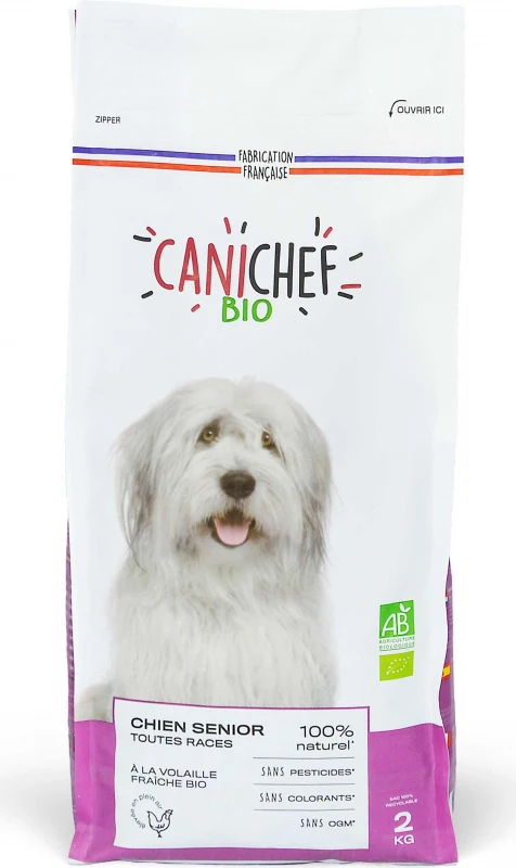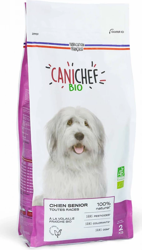 CANICHEF BIO Biologisch droogvoer voor oudere honden is een complete en uitgebalanceerde voeding die voldoet aan de behoeften van honden van alle rassen vanaf 8 jaar. Zonder ggo’s, kleurstoffen of conserveermiddelen zal dit biologische hondenvoer je hond voorzien van alle voedingsstoffen die essentieel zijn voor een goede gezondheid. Dit hondenvoer is AB BIO gecertificeerd door de Ecocert organisatie en is 100% made in France (in Mayenne). De ingrediënten zijn ook 100% Frans.