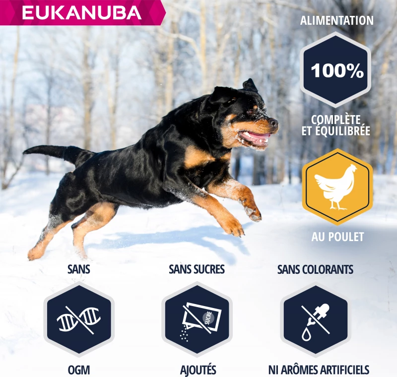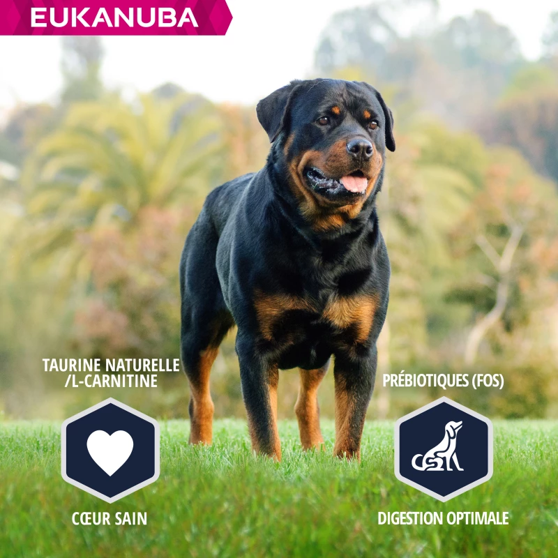 – 8% meer eiwit om de ontwikkeling van sterke spieren te helpen (vergeleken met het ras Eukanuba Adult Large).
