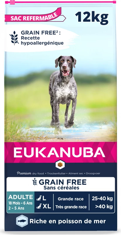 Eukanuba Grain Free * voor volwassen honden van grote rassen is een hypoallergeen recept dat zorgvuldig is samengesteld om veelvoorkomende allergenen te vermijden. De formule bevat glutenvrije zoete aardappel, een natuurlijke bron van vezels, essentiële vitamines en antioxidanten.Â
