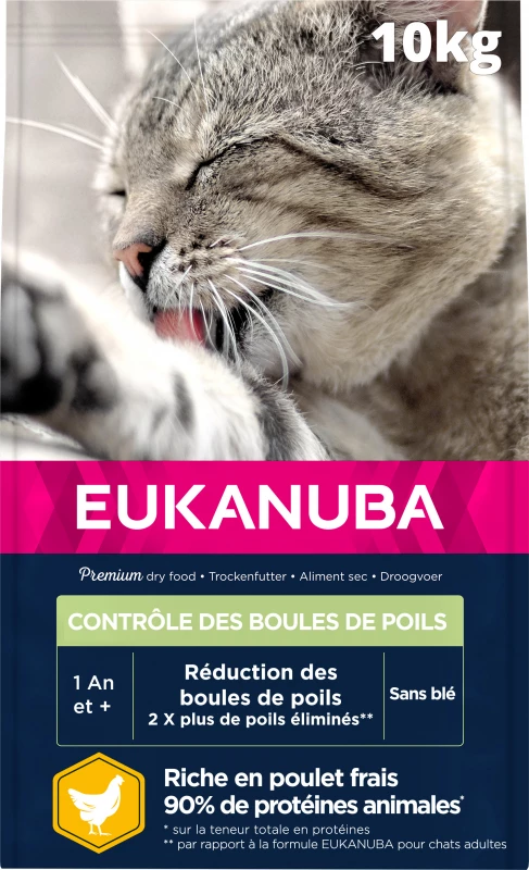 Eukanuba Hairball Control is een complete en uitgebalanceerde voeding voor volwassen katten van alle rassen met de neiging tot het vormen van haarballen (bijv. langharige katten). Deze brokken bevorderen een goede darmgezondheid dankzij prebiotica en dus het verwijderen van haarballen. Het hoge gehalte aan hoogwaardige eiwitten, vitamines en mineralen bevordert een dichte en droge spiermassa en een krachtig immuunsysteem om de dagelijkse vitaliteit te garanderen.