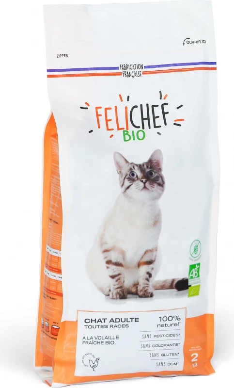 FELICHEF BIO kattenvoer is een compleet en uitgebalanceerd voer dat voldoet aan de dagelijkse behoeften van volwassen katten van alle rassen, vanaf één jaar oud. Zonder granen, GGO’s, gluten, kleurstoffen of conserveringsmiddelen, zal dit biologische kattenvoer je kat voorzien van alle voedingsstoffen die essentieel zijn voor een goede gezondheid. Dit kattenvoer is AB BIO gecertificeerd door de Ecocert organisatie en is 100% made in France (in Mayenne). De ingrediënten zijn ook 100% Frans.