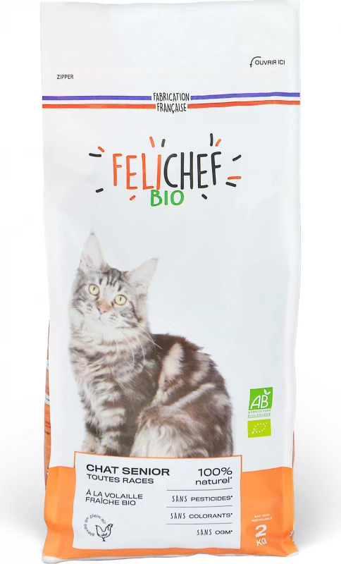 FELICHEF BIO droogvoer voor oudere volwassen katten is een compleet en uitgebalanceerd voer dat voldoet aan de specifieke behoeften van katten ouder dan 8 jaar en van alle rassen. De matige energie-inhoud van deze brokken voorkomt het overgewicht dat minder actieve katten van nature kunnen opnemen. Zonder ggo’s, kleurstoffen of conserveermiddelen, zullen deze biologische brokjes voor oudere katten je poes voorzien van alle voedingsstoffen die essentieel zijn voor een goede gezondheid. Deze brokjes voor oudere katten zijn AB BIO gecertificeerd door de Ecocert organisatie en zijn 100% gemaakt in Frankrijk (in Mayenne). De ingrediënten zijn ook 100% Frans.