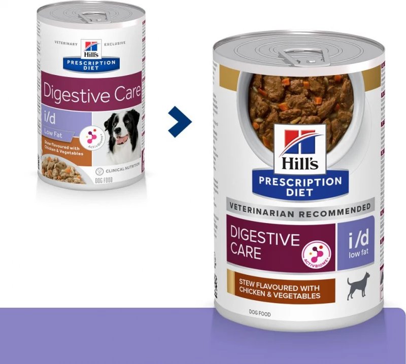 HILL’S Prescription Diet I / D Digestive Care Low Fat is heerlijk natvoer voor volwassen honden met spijsverteringsstoornissen (diarree, opgeblazen gevoel, braken …). Het bevordert een regelmatige spijsvertering en een goede darmgezondheid. Dankzij prebiotica en essentiële vetzuren beschermen en ontwikkelen deze fijnproevers de darmflora om een ??optimale opname van alle essentiële voedingsstoffen voor de goede gezondheid van je hond te garanderen. Ze zullen ook zijn immuunsysteem versterken
