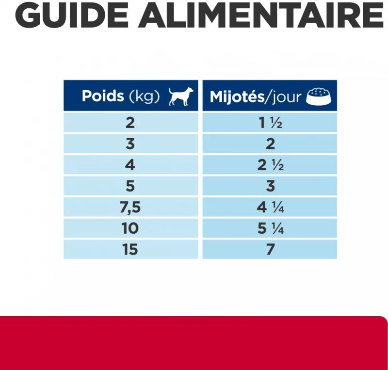 Pas het rantsoen aan om het optimale gewicht te behouden. Vraag bij twijfel advies aan je dierenarts. Voor het beste resultaat: dek het ongebruikte gedeelte af en zet het in de koelkast. Schakel geleidelijk over op het nieuwe voer gedurende een periode van 7 dagen of volg de aanbevelingen van je dierenarts. Laat altijd vers water beschikbaar. Vraag je dierenarts om de toestand van je dier te controleren.
