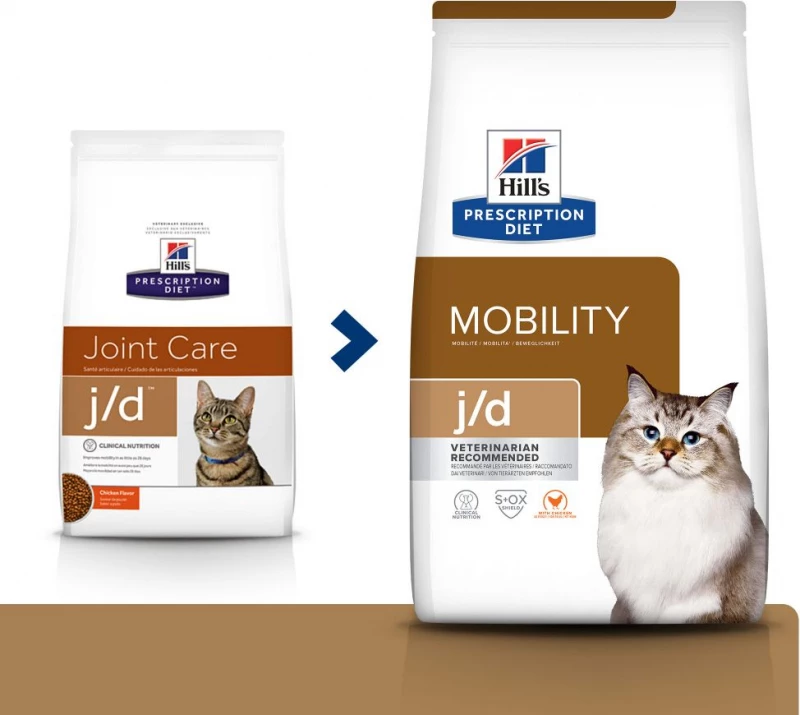Hill’s Prescription Diet J / D Joint Care medisch kattenvoer voor volwassen katten is speciaal ontwikkeld voor volwassen katten met gewrichts- en kraakbeenproblemen. Rijk aan EPA, omega 3-vetzuren en vitamine E. Dit voer bevordert het gezamenlijke metabolisme en is ideaal voor artrose. De toevoeging van glucosamine en chondroïtinesulfaat helpt de elasticiteit van het kraakbeen te behouden en de gewrichtsmobiliteit te bevorderen. Klinische studies hebben aangetoond dat Hill’s Prescription Diet j / d Joint Care-brokken de mobiliteit en het welzijn van katten in slechts 28 dagen verbeteren.