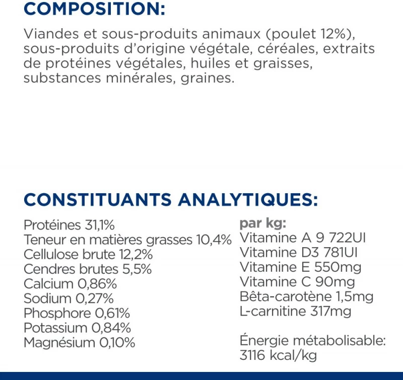 Kip (minimaal 16%), gemalen maïs, maïsglutenmeel, gedehydrateerde kip- en kalkoenproteïne, gedroogde bietenpulp, erwtenmeel, sojameel, hydrolysaat, dierlijk vet, plantaardige olie, DL-methionine , L-lysinehydrochloride, zout, L-carnitine, gemalen rijst, taurine, L-tryptofaan, vitamines en sporenelementen. Bevat een EU-goedgekeurde antioxidant.