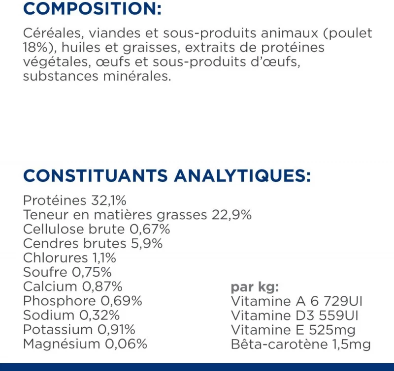 Kip: Gedehydrateerde kip (39%) en kalkoenproteïnen, maïs, brouwrijst, dierlijke vetten, maïsglutenmeel, sojaolie, heel eipoeder, mineralen, hydrolysaat, taurine, vitaminen, sporenelementen en beta-caroteen. Met een natuurlijke antioxidant (mengsel van tocoferolen).