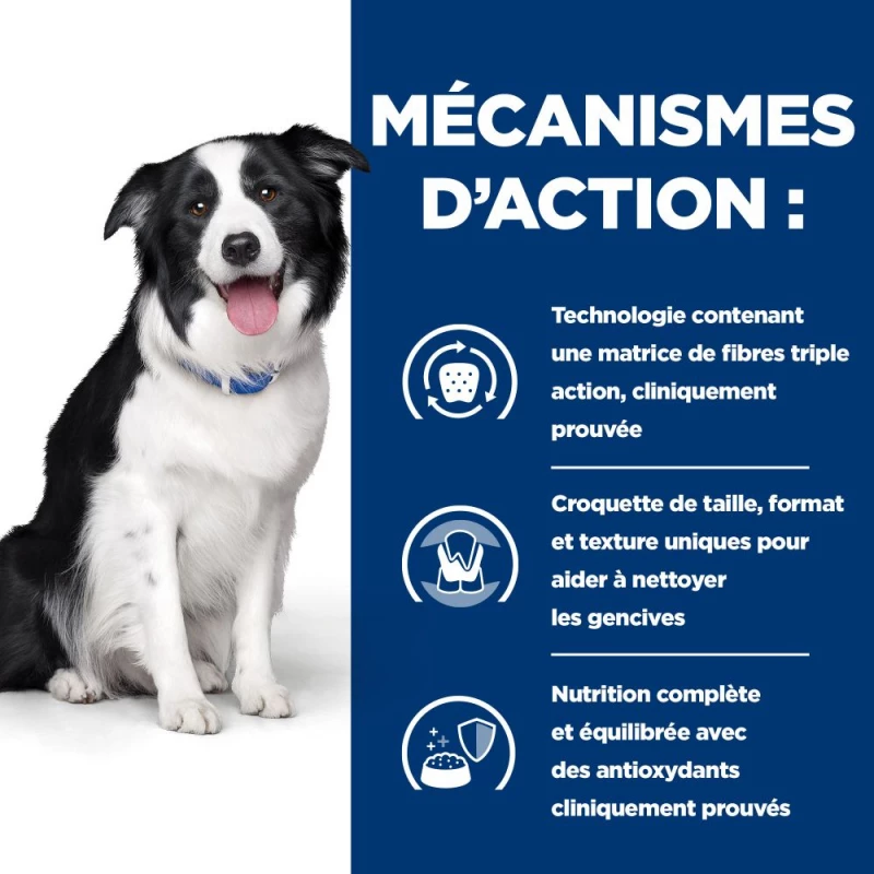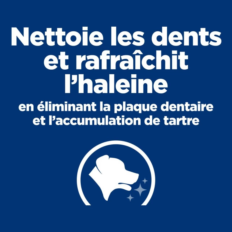 Hill’s Prescription Diet Canine T / D Dental Care hondenvoer voor volwassen honden is speciaal samengesteld om tandsteen en tandplak te voorkomen. Deze complete voeding bevat een speciale technologie met vezelmatrix die het tandoppervlak reinigt en zo de vorming van tandplak en verkleuring van tanden vermindert. Dit hondenvoer voorkomt ook de opbouw van met bacteriën beladen tandplak. Ze dragen dus bij aan de hygiëne van het gebit van je hond en helpen een slechte adem te verminderen.