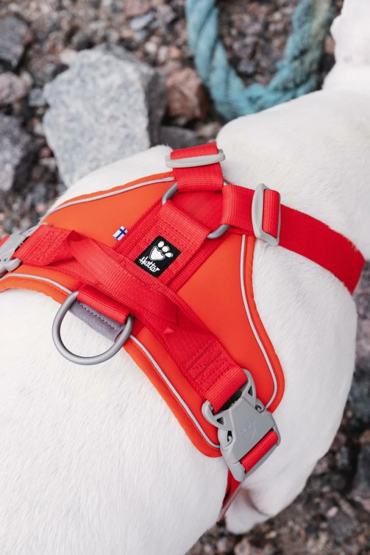 De duurzaamheid van kwetsbare onderdelen van het harnas en handvat is gewaarborgd met extra stiksel. Hurtta Outdoor, Weekend Warrior harness is voorzien van 3M reflecterende strepen voor zichtbaarheid in het donker. De metalen sluitingen zijn ontworpen en vervaardigd specifiek voor dit ontwerp. De treksterkte van de metalen onderdelen is getest door SGS. Andere gespen zijn gemaakt van duurzaam kwalitatief hoogwaardig kunststof. Dankzij de gespen aan beide zijden van de borst is het harnas gemakkelijk aan te doen en de hond hoeft zijn poten niet op te tillen.Â