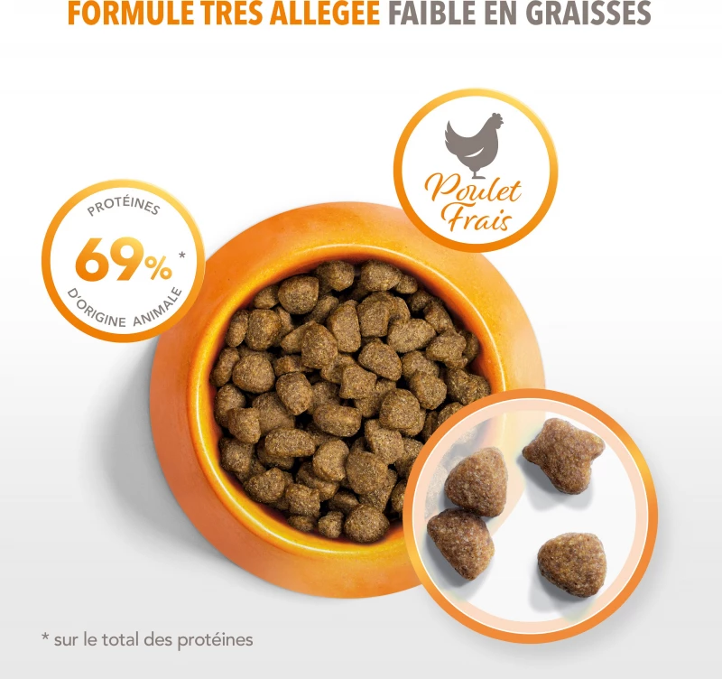 Kip: maïs, gedehydrateerde kip en kalkoen 19% (inclusief kip 11%), maïsgrutten, gerst, sorghum, verse kip (4,1%), dierlijk vet, gedehydrateerde bietenpulp (3,8%), kippensap, mineralen (inclusief natriumhexametafosfaat (0,38%), fructo-oligosachariden (0,21%), visolie, gedehydrateerde biergist.