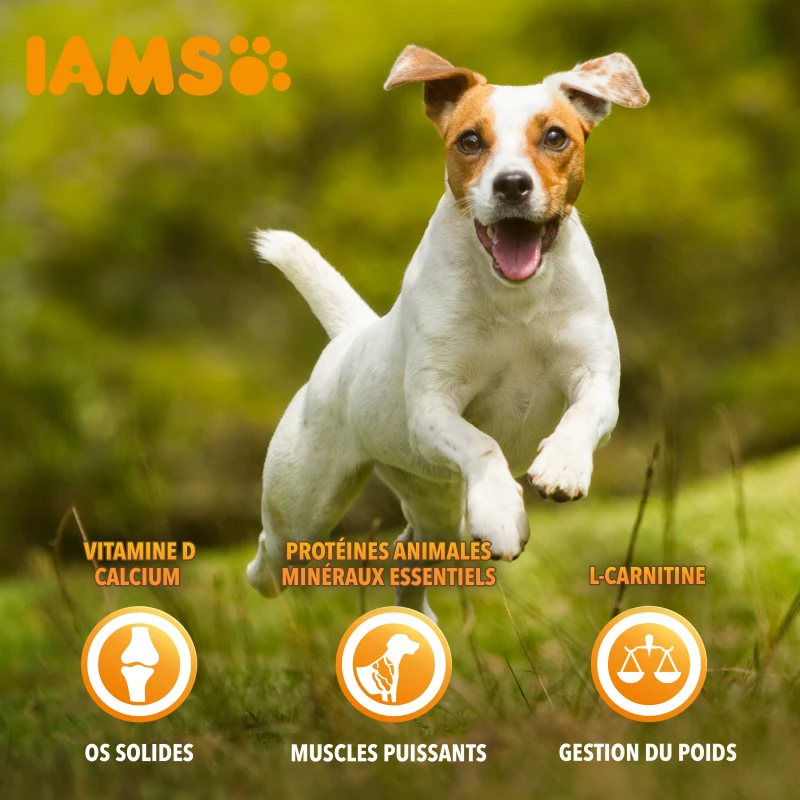 Dit recept is 30% minder vet dan ons recept voor volwassen honden voor gewichtstoename (vergeleken met IAMS Adults with Fresh Chicken). Onze krokante brokjes met een aangepast mineraalgehalte helpen de vorming van tandsteen te verminderen en zo de mondhygiëne van je huisdier te bevorderen. IAMS is een mix van omega-3 en omega-6 vetzuren die de gezondheid van de huid en de glans van de vacht ondersteunen. Essentiële mineralen, vitamine D en hoogwaardige eiwitten ondersteunen sterke botten en spierontwikkeling. Ons recept bevat ook een mix van antioxidanten, samen met vitamine C en E om het immuunsysteem te versterken. De juiste mix van vezels, prebiotica en bietenpulp bevordert de spijsvertering.