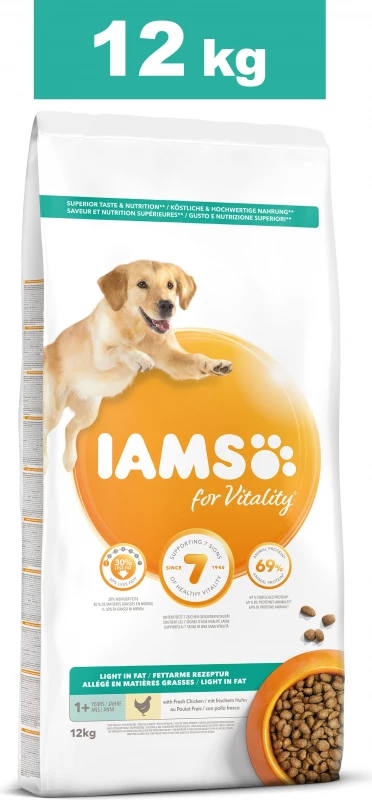 IAMS Vitality light brokjes voor volwassen en oudere honden van alle rassen is een compleet en uitgebalanceerd recept ontworpen voor de gezondheid van je hond. Ons nieuwe en verbeterde recept met verse kip is gebaseerd op hoogwaardige dierlijke eiwitten, zorgvuldig geselecteerd om de zeven tekenen van vitaliteit te ondersteunen. Met 69% dierlijke eiwitten (ten opzichte van de totale hoeveelheid eiwit) houdt ons recept je ??hond gezond, actief en vol leven. Dit recept is ontworpen voor honden met overgewicht of gesteriliseerde honden en is ideaal om gewichtstoename tegen te gaan. We stellen onze expertise ten dienste van de voeding van je hond zonder concessies te doen aan de smaak om de zeven tekenen van de vitaliteit te bevorderen.