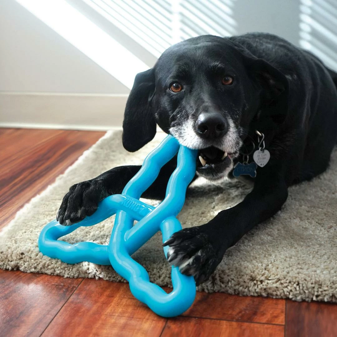 De Kong Flyangle is zacht voor tanden en tandvlees. Dit drijvende speeltje is geweldig voor trek- en bijtspelletjes tussen twee honden of tussen het baasje en de hond.