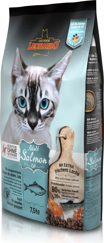 Leonardo Adult GF Salmon Salmon Cat Foods zonder granen werden ontwikkeld om te voldoen aan de voedingsbehoeften van volwassen katten vanaf de leeftijd van 1 jaar. Ze zijn graan- en glutenvrij en bieden ook een complete en ideale voeding voor gevoelige volwassen katten die lijden aan voedselintoleranties of allergieën.