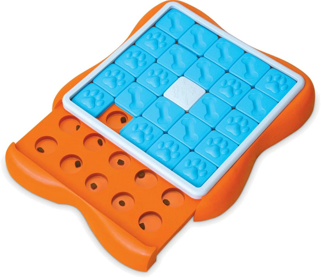 Met 24 verborgen traktatiecompartimenten is de Nina Ottosson Challenge Slider hondensnoeppuzzel een van onze meest uitdagende puzzels tot nu toe! Nina Ottosson traktatiespellen zijn een geweldige manier om de geest van je hond te betrekken bij uitdagende en lonende activiteiten. In dit spel moeten honden elke schuif één voor één in verschillende richtingen bewegen om verborgen lekkernijen of voedsel te onthullen.
