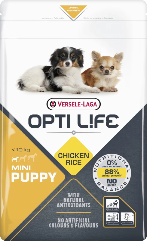 De Opti Life – mini-puppybrokjes van 7,5 kg zijn samengesteld met kip en rijst en bevatten een hoge concentratie omega-3 EPA- en DHA-vetzuren om het zenuwstelsel van je puppy te versterken.