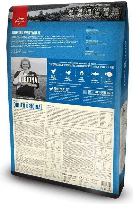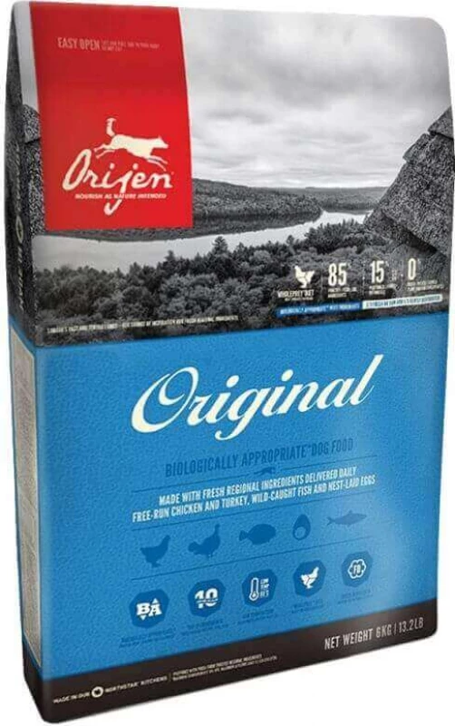 – De producten van ORIJEN bevatten 38% voedzame eiwitten en niet meer dan 19% koolhydraten voor de voeding van honden van alle rassen en in alle levensfasen die evolutionair en biologisch vereist is.