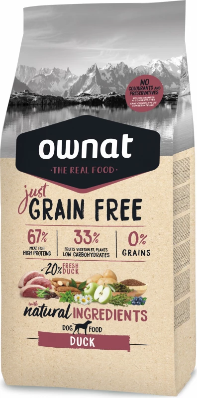 OWNAT Just Grain Free met eend voor honden bevat eiwitten van de hoogste voedingskwaliteit en een hoog gehalte aan omega-3-vetzuren die voordelen bieden voor de huid, het haar en het immuunsysteem.