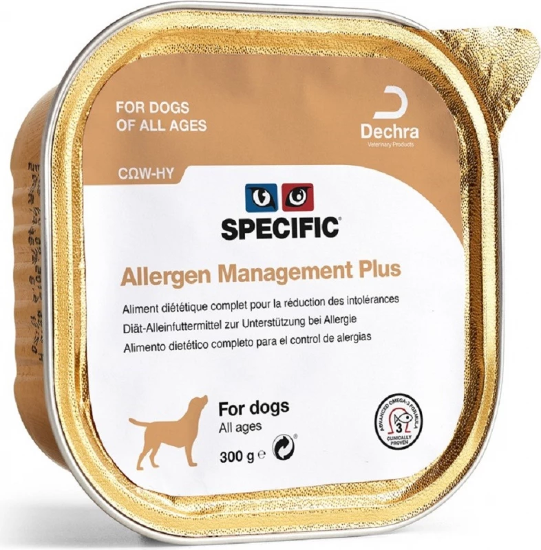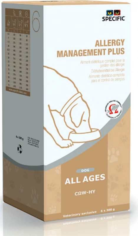 SPECIFIC COW-HY Allergy Management Plus medische voeding wordt aanbevolen voor volwassen honden, senioren en puppy’s die gevoelig zijn of lijden aan voedselintolerantie. Ze helpen de huidfunctie te ondersteunen bij dermatose en ontharing. Ze verminderen ook de intolerantie voor bepaalde ingrediënten en voedingsstoffen, evenals het risico op acute intestinale malabsorptie en compenseren een slechte spijsvertering. Gehydrolyseerd zalmeiwit met een molecuulgewicht <3000 dalton is goed verteerbaar en laag allergeen. De huid heeft een hoog metabolisme en hoge eisen aan verschillende specifieke voedingsstoffen. De hoge gehaltes aan vitamine A, E en B, zink en selenium hebben een gunstige invloed op de gezondheid van huid en vacht. Dankzij de goed verteerbare ingrediënten en van uitstekende kwaliteit is de voeding vooral aangewezen voor honden met diarree in de dunne darm. Dit complete en uitgebalanceerde voer, met de voedingsniveaus die worden aanbevolen om in de voedingsbehoeften van puppy’s en volwassen honden te voorzien. Het voer kan dus ook tijdens de groei worden verdeeld.