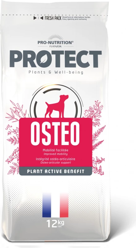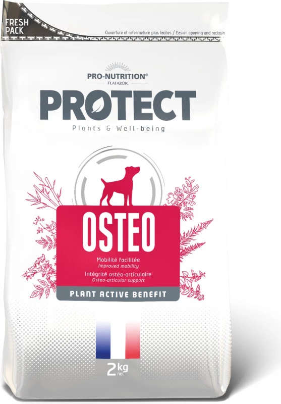 PRO-NUTRITION PROTECT Osteo hondenvoer wordt aanbevolen voor volwassen honden met gewrichtsaandoeningen of die na verloop van tijd mogelijk problemen zullen hebben (bijvoorbeeld: honden van grote en zeer grote rassen). Dankzij fyto-ingrediënten zoals bamboe, fijnstraal, moerasspirea of zwarte bes, bevorderen deze brokjes de flexibiliteit van de gewrichten en beperken ze pijn. Chondroïtine en glucosamine helpen botten en gewrichten te beschermen. Dit Protect Osteo-recept heeft ook een matige energie-inname, waardoor elk risico op overgewicht en dus ‘gewichtgerelateerde gewrichtsaandoeningen wordt vermeden.