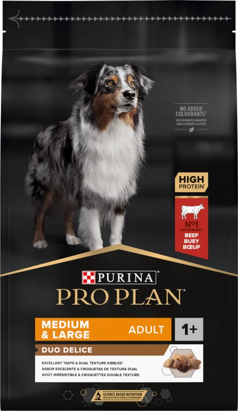 Purina Pro Plan Adult – Duo Délice biedt een 100% complete en uitgebalanceerde voeding met de juiste mix van voedingsstoffen om de gezondheid en het welzijn van jouw hond te ondersteunen. Duo Délice helpt ook om het gebit en spijsvertering gezond te houden. Duo Délice is ontwikkeld met een combinatie van krokante brokjes en malse stukjes. Op deze manier kan je hond genieten van de smakelijke brokken en toch de essentiële voedingsstoffen binnen krijgen.
