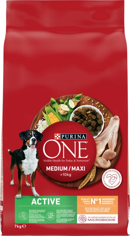 MEDIUM / MAXI> 10kg Actieve brokjes, ontwikkeld door onze PURINA®-experts, bieden een hoge voedingswaarde die is aangepast aan de behoeften van middelgrote en grote honden, met een hoog eiwit- en vetgehalte om je hond te helpen voldoende energie te hebben tijdens perioden van activiteit. Probeer het assortiment PURINA ONE® MEDIUM / MAXI> 10 kg en zie de zichtbare resultaten op het gebied van welzijn.