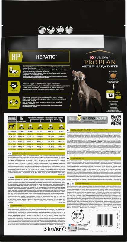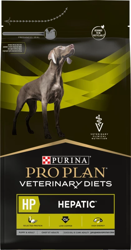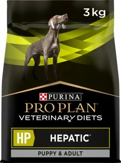 Pro Plan Veterinary Diets Canine HP Hepatic medisch hondenvoer wordt aanbevolen voor volwassen honden en puppy’s ouder dan 14 weken die lijden aan leverfalen. Dit complete veterinaire voer is samengesteld met een beperkt kopergehalte om de opbouw van koper in de lever te helpen verminderen. Deze voedingsmiddelen zijn ontwikkeld met een eiwitgehalte van matige kwaliteit om de ophoping van schadelijke gifstoffen en een hoog gehalte aan vetzuren en koolhydraten met een hoge verteerbaarheid te minimaliseren.