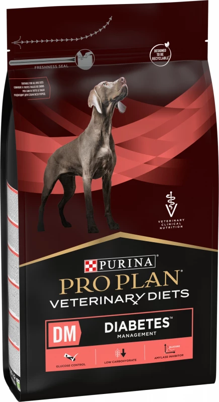 Purina Pro Plan Veterinary Diets DM Diabetes Management wordt aanbevolen voor volwassen honden met diabetes mellitus. Het is speciaal ontwikkeld voor de voedingsbehandeling van diabetes bij honden, door te helpen bij het reguleren van het glucosegehalte (suiker) in het bloed. Het bevat extract van witte bonen (bron van amylaseremmer) waarvan is aangetoond dat het de opname van koolhydraten bij honden beperkt en schommelingen in de bloedglucose na de maaltijd helpt verminderen. Het is ook geformuleerd met verlaagde koolhydraatwaarden en het bevat complexe koolhydraten die helpen bij het reguleren van de bloedglucosespiegel. Voedingsvezels helpen de opname van koolhydraten te vertragen en zijn daarom erg handig voor honden met diabetes. Diabetes schaadt ook het immuunsysteem, waardoor honden een groter risico lopen op infecties. Daarom bieden antioxidantensupplementen, zoals vitamine E, aanzienlijke voordelen door de natuurlijke afweer van diabetische honden te ondersteunen en de schadelijke effecten van vrije radicalen te neutraliseren.