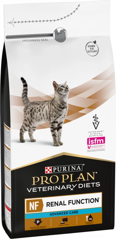 PRO PLAN Veterinary Diets Feline NF ST/OX Renal Function wordt aanbevolen voor volwassen katten met nierinsufficiëntie. Dit complete veterinaire dieet bevat een verlaagd fosforgehalte, omdat bekend is dat dit mineraal bijdraagt ??aan de progressie van de ziekte. Dit dieet bevat ook een beperkte hoeveelheid hoogwaardige eiwitten om de vorming van gifstoffen te minimaliseren en tegelijkertijd de spiermassa te behouden. Omega-3-vetzuren helpen hypertensie en nierontsteking te minimaliseren.