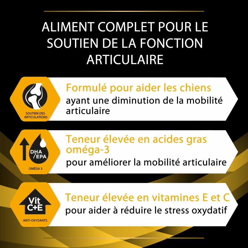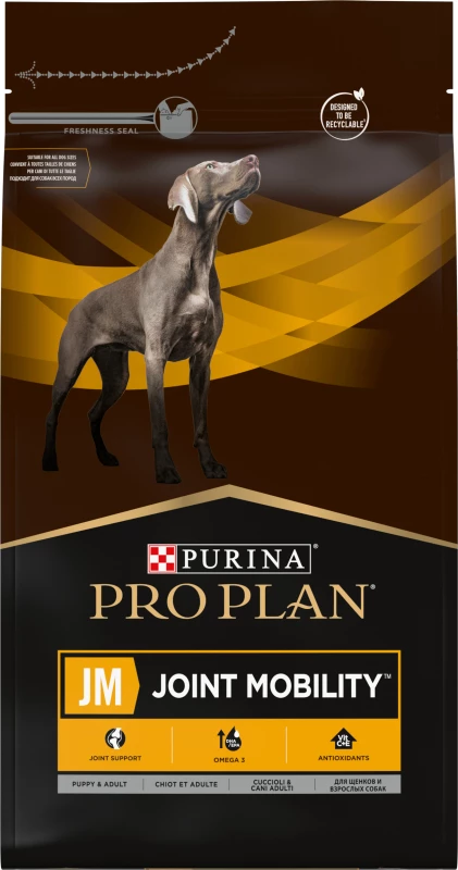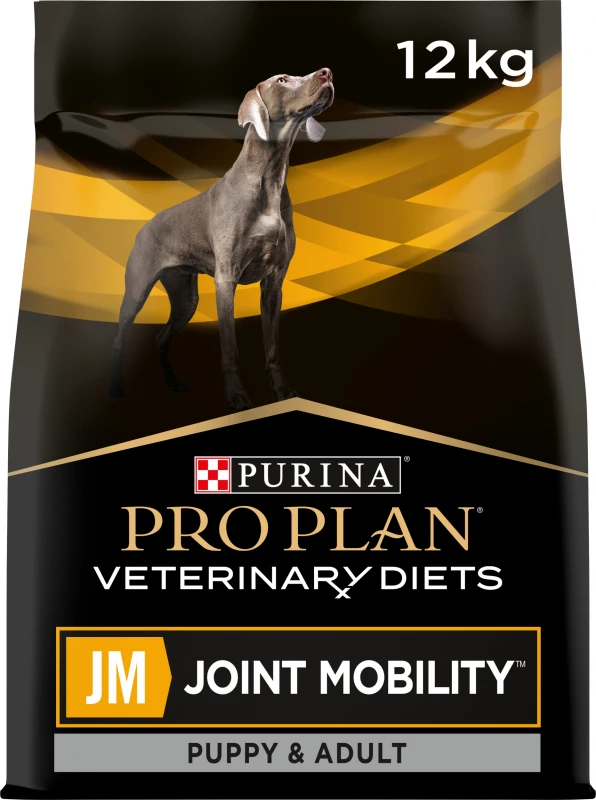 Purina Pro Plan Veterinary Diets – JM Joint Mobility hondenvoer is een voedingsbehandeling voor honden, die aan arthrose lijden. Artrose is de meest voorkomende oorzaak van chronische pijn bij volwassen en oude honden. Onderzoeken hebben uitgewezen dat eicosapentaenzuren (EPA) helpen de enzymen, die schade aan kraakbeen veroorzaken, te reduceren. De passende verhouding van de vetzuren Omega-3 en Omega-6 dragen er aan bij de ontstekingen te reduceren. Versterkte percentages glucosamine en chondroitine ondersteunen het behoud van gewrichtskraakbeen.