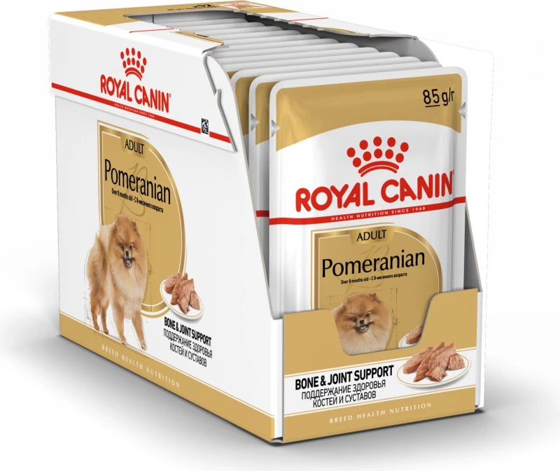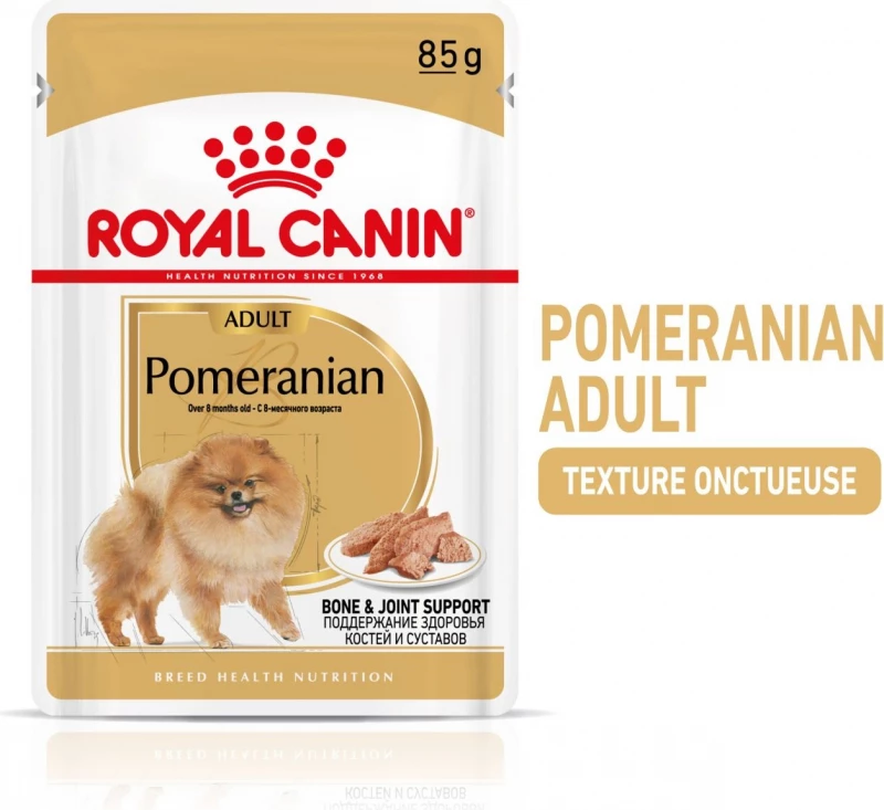 ROYAL CANIN® Pomeranian Adult mousse is een exclusieve formule speciaal ontwikkeld voor volwassen dwergkees. Deze voeding voor volwassen Dwergkezen bevat een aangepast gehalte aan mineralen en andere specifieke voedingsstoffen die bijdragen aan een goede gezondheid van de botten, gewrichten, kraakbeen van je hond.Â