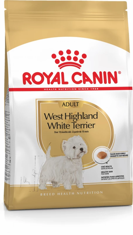 Royal Canin heeft Royal Canin Breed Adlt West Highland White Terries ontwikkeld speciaal voor volwassen witte terriërs van 1 tot 7 jaar oud. De aminozuren zorgen voor de groei en vernieuwing van de vacht tevreden te stellen. Specifieke omega 6- (van borageolie) en omega 3-vetzuren (uit visolie en lijnzaad) verbeteren de witte glans van de vacht.