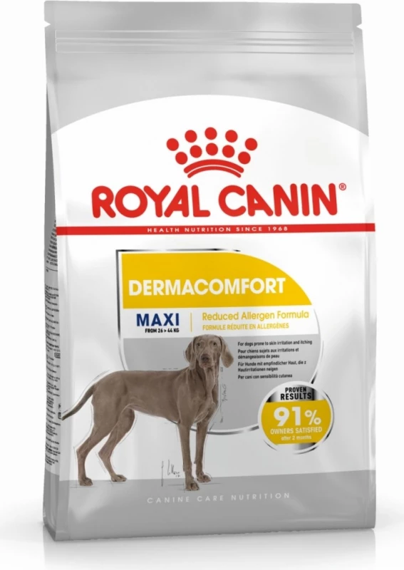 Het Royal Canin Maxi Adult Dermacomfort is speciale gezonde voeding voor gevoelige honden met jeukende of geïrriteerde huidaandoeningen. Dit dieet is geschikt voor volwassen grote honden ouder dan 15 maanden met een gewicht van meer dan 25 kg.