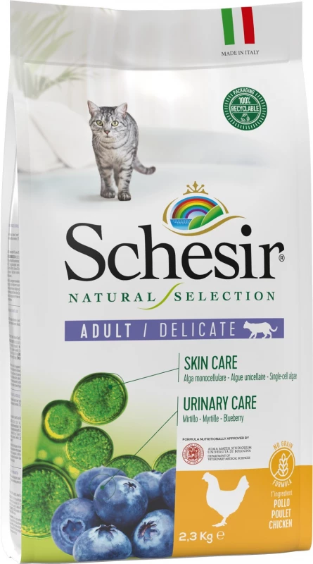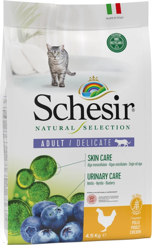 Schesir Natural Selection Adult met Kip is een complete en uitgebalanceerde voeding voor volwassen katten. Graanvrije en glutenvrije formule.