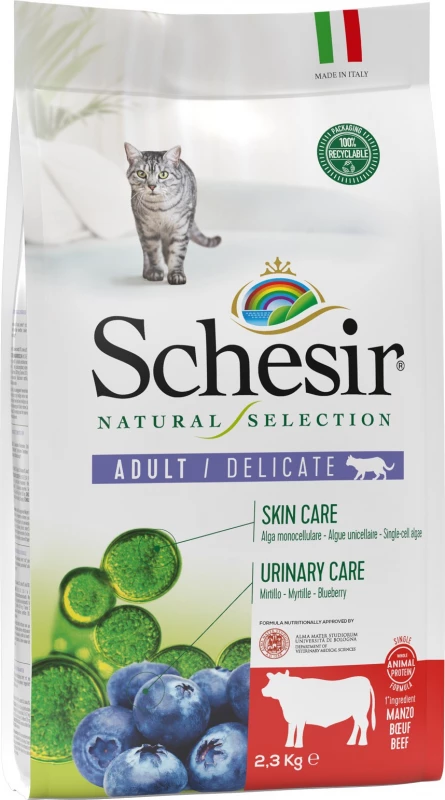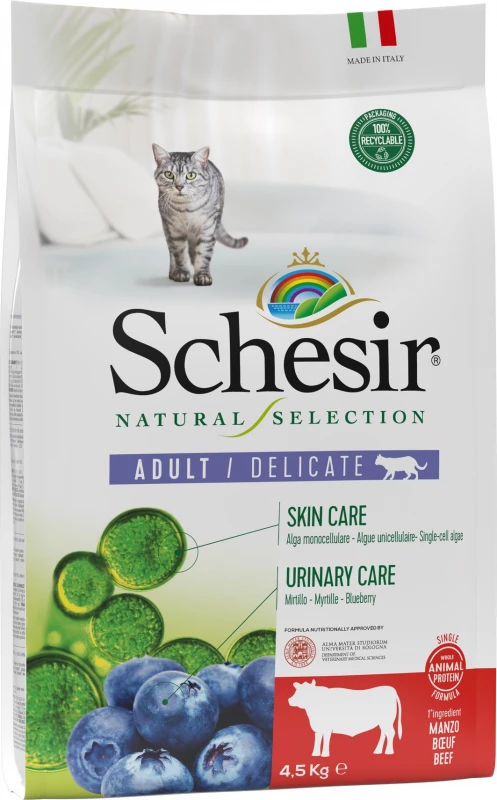 Schesir Natural Selection Adult Mono Protein Beef is een complete en uitgebalanceerde voeding voor volwassen katten. Geformuleerd met een enkel dierlijk eiwit dat het risico op intolerantie vermindert.
