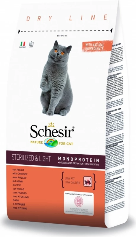 SCHESIR Monoproteïne brokjes worden aanbevolen voor gesteriliseerde katten of katten met overgewicht ouder dan een jaar. Dit complete en uitgebalanceerde kattenvoer is zeer verteerbaar en vooral mono-eiwit! Het bevat slechts één eiwitbron (hier kip) en is daarom ideaal voor gevoelige of intolerante katten (bijvoorbeeld allergieën). De gematigde energie-inhoud van deze brokken maakt gewichtscontrole mogelijk zodat je kat een harmonieuze lijn behoudt of terugkrijgt. Taurine daarentegen versterkt de hartfunctie en gezichtsscherpte. Vlees is altijd het eerste ingrediënt in zijn recept, een garantie voor zijn hoge kwaliteit. Deze 100% natuurlijke brokken bevatten een hoog gehalte aan mineralen en vitamines voor een betere gezondheid en vol vitaliteit. Ze bevatten geen kleurstoffen of conserveermiddelen.