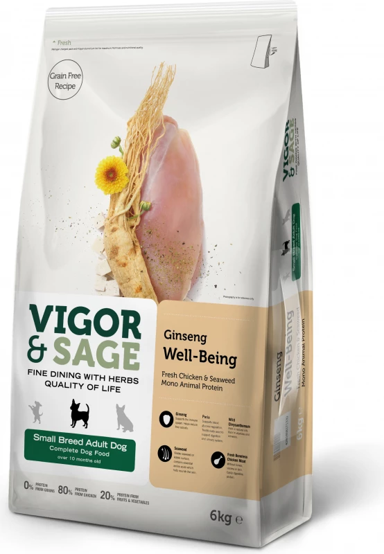 BESCHRIJVING VAN Vigor & Sage Ginseng Well Being Grain Free Small Breed Adult Dog, met kip & zeewier