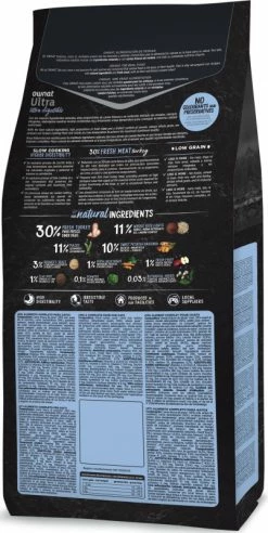 Vers kalkoenvlees (26,0%), gedehydrateerde kalkoen (22,0%), aardappel, erwten, kippenvet, zalmolie, lijnzaad, zeewier (0,4%), bietenpulp, biergist, blad van lotus (0,14%), meidoorn (0,14%), kassieboomzaad (0,14%), wortel, banaan, selderij, pruim, citroen, fructo-oligo-sacchariden (FOS), yucca.